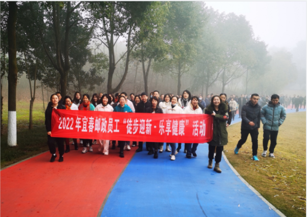 在徒步活動中,175名員工在紅藍相間的健身步道上,披著晨霧闊步向前,用徒步這一時尚而健康的方式開啟了2022年的迎新序曲。清晨,宜春郵政員工們從袁山公園北門圓盤廣場出發,沿著袁山公園健身道徒步而行,開始了5公里的快樂里程。大家奮勇向前,展示出宜春郵政員工積極向上的精神面貌。歡快的笑語、攜手的鼓勵,奮力的角逐,暢快的汗水,揮灑在健身道上,形成一道與自然和諧共處的亮麗風景。