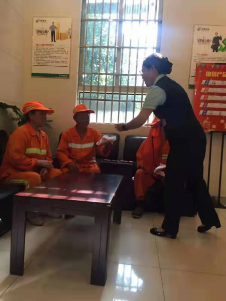 在驛站內,桌椅、手機充電線、應急藥箱、微波爐、飲水機、冰箱、空調、無線網等一應俱全,戶外工作者如受小傷,可到這里擦擦酒精,做些簡單的處理。天冷時,大家能過來用微波爐加熱飯菜。天熱時,可入內歇歇腳,今年夏天氣溫最高的時候,網點還煮了綠豆湯,供周邊的戶外工人休息時喝,得到了附近環衛工人的一致好評。