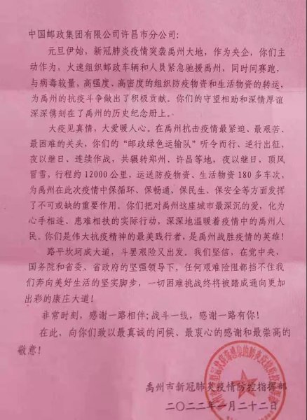近日,禹州市新冠肺炎疫情防控指揮部發來感謝信,對許昌“郵政綠色運輸隊”聽令而行、逆行出征、馳援禹州,助力疫情防控”給予了充分肯定和高度評價。許昌“郵政綠色運輸隊”的10名隊員還被市郵政管理局授予全市郵政行業“抗擊禹州新冠肺炎疫情突出貢獻先進個人”榮譽稱號。