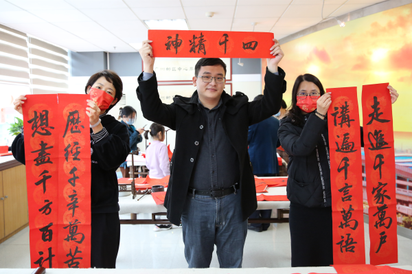 東莞郵政工會在新春前夕結合自身優勢,發動職工自選對聯內容,并請來市分公司紀委辦鄭芳森主任、書法家許統誠,為大家現場揮春送福。他們凝神聚氣、揮毫潑墨,以雄健的筆力、律動的氣韻,抒寫新時期郵政人對一年之春的美好寄望。一張張紅紙,一副副春聯,一份份祝福,襯托出濃濃的年味,就像冬天的一把火,暖熱了職工們的心窩,營造了幸福、祥和的濃濃年味。