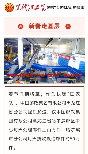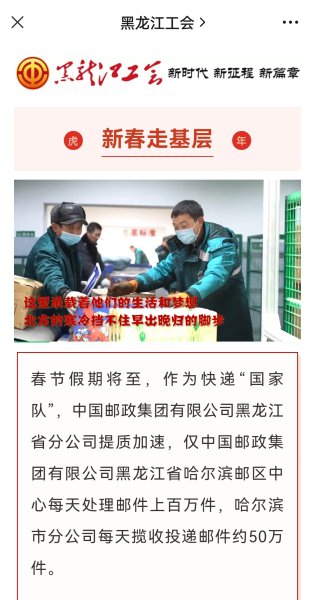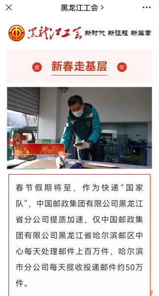 全省郵政基層職工積極踴躍地拍攝了春節在崗的工作圖片和講出發自肺腑的祝福語。黑龍江省郵政工會在“黑龍江營業廳”公眾號上擇優發布了4期36條圖文信息。同時,省郵政工會向黑龍江省總工會積極推薦,春節期間在“黑龍江工會”公眾號上發布了4條圖文信息。并邀請省總工會融媒體中心記者專程采訪了哈爾濱市分公司的一線職工,拍攝了“新春走基層”視頻《快遞“國家隊”的郵路擔當》,在2月3日通過“黑龍江工會”公眾號進行宣傳。