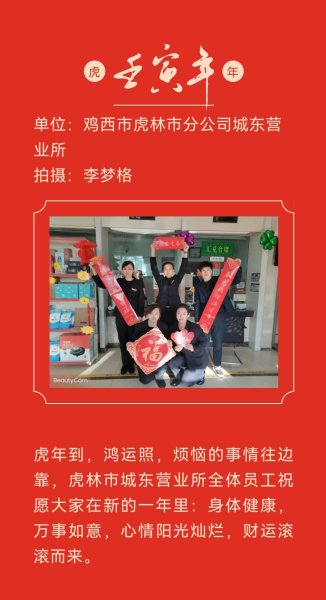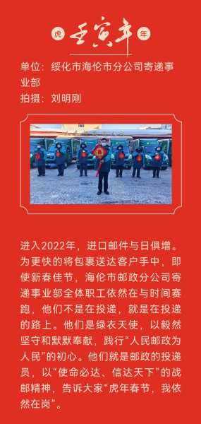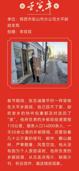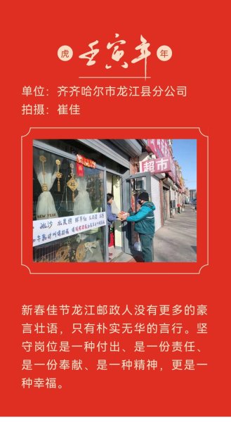 在虎年春節期間,為確保百姓民生,服務地方經濟,龍江郵政職工堅守崗位、奮戰一線,以實實在在的行動踐行“人民郵政為人民”的服務宗旨,用辛勤和汗水詮釋勞動精神,用行動和奉獻祝福祖國繁榮富強。黑龍江省郵政工會組織全省郵政基層職工開展了“虎年春節我在崗”主題活動,履行職責使命,展現國企擔當,塑造郵政形象。