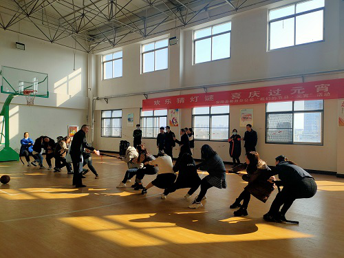 此次活動除了傳統(tǒng)節(jié)目猜燈謎以外,還設(shè)置了拔河、投籃和乒乓球三項體育比賽。活動現(xiàn)場,印制有燈謎的彩旗掛在活動室周圍,彩旗飄飄,充滿了喜氣洋洋的熱鬧氣氛。員工們來到活動室瀏覽謎面,或駐足觀望,或凝神思考,或互相討論,從眉頭緊皺到喜笑顏開,謎底被大家紛紛猜中。在拔河比賽中,參賽職工同心協(xié)力、鉚足勁頭拼命拉繩,加油助威的啦啦隊也熱情高漲、激動萬分。在投籃比賽和乒乓球比賽中參賽職工磨拳擦掌、展示技巧,獲得觀看者的陣陣掌聲。