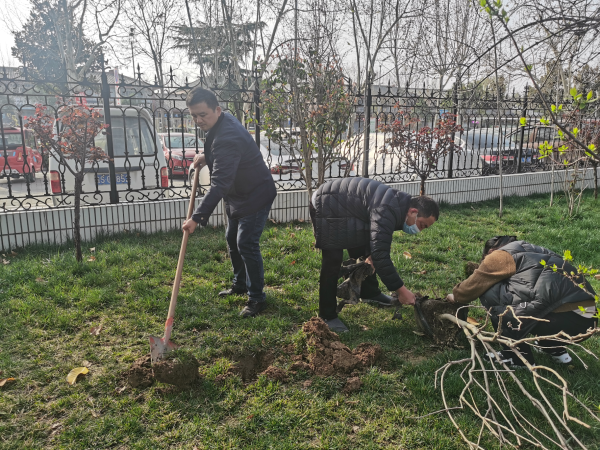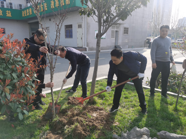 植樹現(xiàn)場,大家熱情高漲,按照預(yù)先分組,把采購的迎春、海棠、月季、紫荊、紫藤、碧桃、丁香等60余株樹苗運(yùn)到目的地,全體員工立即投入到植樹勞動中。員工們兩兩一組,分工協(xié)作,挖土填坑。大家埋頭苦干,揮灑汗水,植樹現(xiàn)場一片熱火朝天的勞動景象。經(jīng)過一上午的努力,所購樹苗全部栽種成功,每顆樹苗都凝聚了大家的汗水與寄托,整個活動取得了圓滿成功。