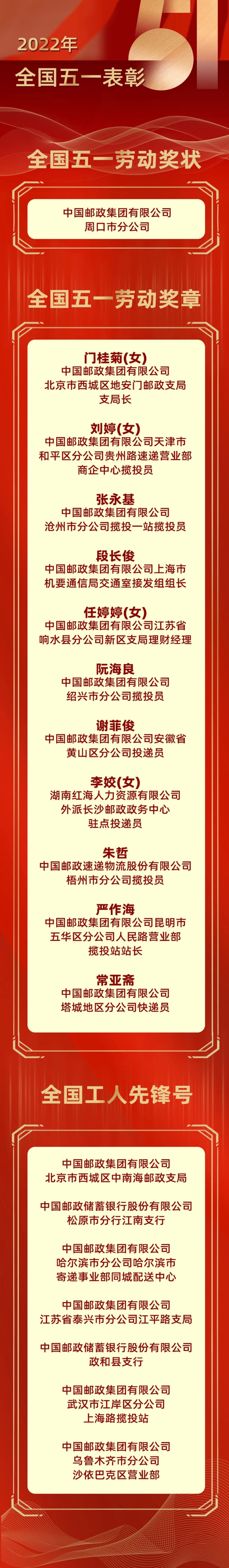 4月28日,中華全國總工會在京召開2022年慶?!拔逡弧眹H勞動節暨全國五一勞動獎和全國工人先鋒號表彰大會。全國郵政系統有1個集體獲全國五一勞動獎狀,11名個人獲全國五一勞動獎章,7個集體獲全國工人先鋒號。