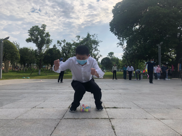 最后的活動項目是袋鼠下蛋,由隊員膝蓋位置夾放雞蛋1或2枚,在起點位置模擬袋鼠跳動的運動方式,將雞蛋運送至終點并將雞蛋準確落入模擬雞窩內。