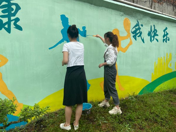 在崇陽縣分公司的支持下,他們買來涂料,利用休息時間開始了彩繪墻的工作。補墻灰、涂料調色、圖案設計、繪制等工作均由自已動手完成。負責繪畫主筆的是今年剛入職的大學生員工黃靖,大學專業是環境設計的她具有很強的繪畫功底。大家分工協作,一筆一畫認真繪制,“我運動 我健康 我快樂”的主題彩繪墻很快完工。