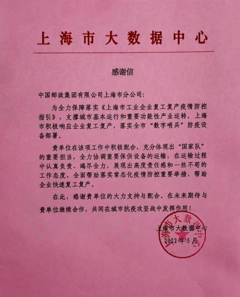 5月初松江區(qū)分公司收到上海市大數(shù)據(jù)中心發(fā)來的求助函,函中表述了為實現(xiàn)數(shù)據(jù)賦能復工復產(chǎn),擬在重點場所推行“數(shù)字哨兵”,但是由于緊急調(diào)配的一批保供設備在浙江省嘉興市嘉善縣,因物流原因無法及時發(fā)往上海,希望得到郵政的幫助。