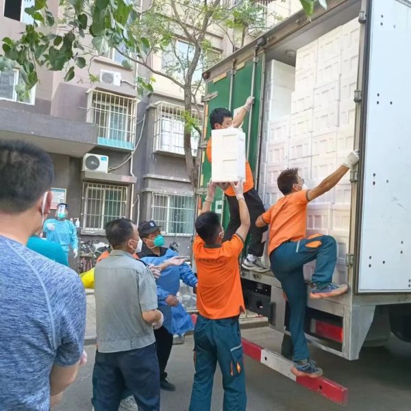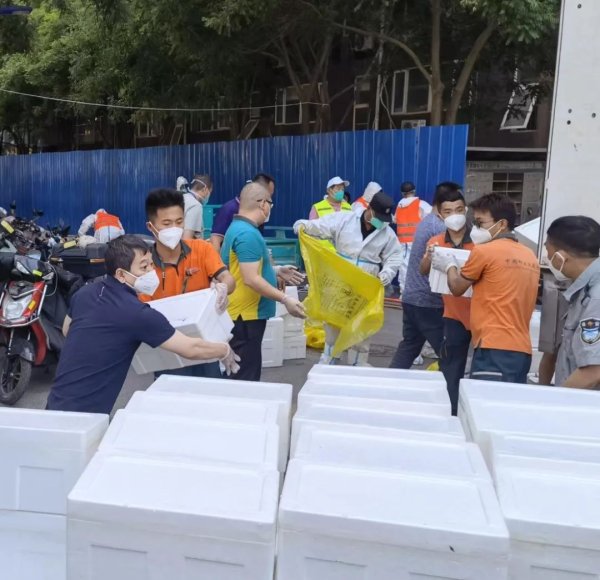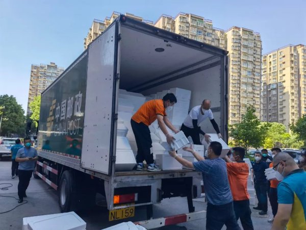 5月29日中午, 頂著30度的高溫, 豐臺郵政人與社區志愿者隊伍配合, 將3900份蔬菜套餐和 6400斤延慶愛心生菜, 全部配送到封控區20棟樓的單元門口, 用實際行動為疫情防控做出了郵政人的又一份貢獻。