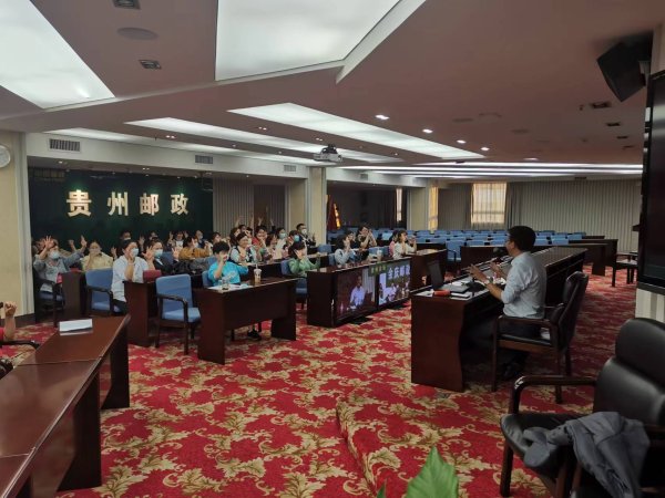 圖片說明:在貴州省郵政分公司講座現場,授課老師與學員互動跳手指舞,現場充滿歡聲笑語。