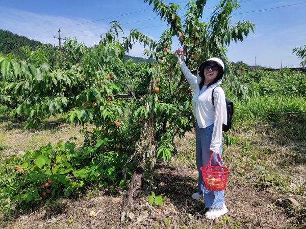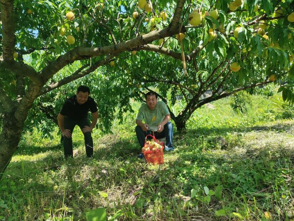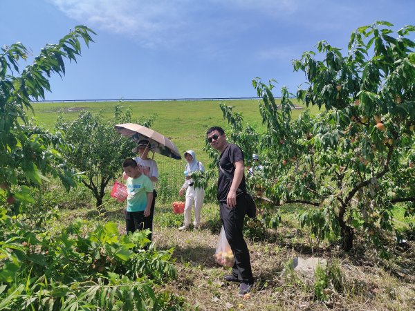 在黃金水庫旁,放眼望去,藍天白云碧水漣漪,偶爾跳出水面的小魚,還有那追逐嬉戲的鳥兒,構成了一幅絕好的水墨丹青。下車后,大家歡快地奔向采摘園,呼吸著山林的清新空氣,感受著大自然的隨心暢意,大家的心情分外輕松。累累蜜桃散發出誘人的果香掛滿枝頭,樹枝都被壓彎了腰。摘蜜桃、品蜜桃......采摘的快樂、品嘗的喜悅、打趣的笑聲溢滿采摘園。每個人都收獲滿滿,體驗了自由采摘帶來的收獲與快樂。大家一路歡聲笑語,平時工作的疲勞都融化在這陽光明媚的時光里。