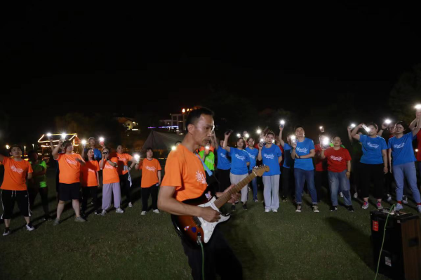 晚上7點30分,篝火晚會正式開始,大家齊聚草坪,市分公司副總經理、工會主席張宏茂手握火把,點燃象征陽光心態的熊熊篝火,并宣布篝火晚會正式開始。隨后,主持人帶領大家圍成一圈做游戲,隊員們在游戲過程中充分享受到了團隊合作的樂趣。晚會上,最驚喜的莫過于四支隊伍的才藝表演,四分隊薛惠俊舞蹈《只此青綠》為大家呈現了“每一幀都是圖畫”的舞蹈魅力,還有個人塤獨奏,電吉它演奏……最后一首《朋友》,引起了大家的共鳴,大家用深情的歌聲唱出了常州郵政的團結和友愛,歌聲表達出常州郵政人最誠摯、真實的情感,將整場晚會的氣氛推向了高潮。