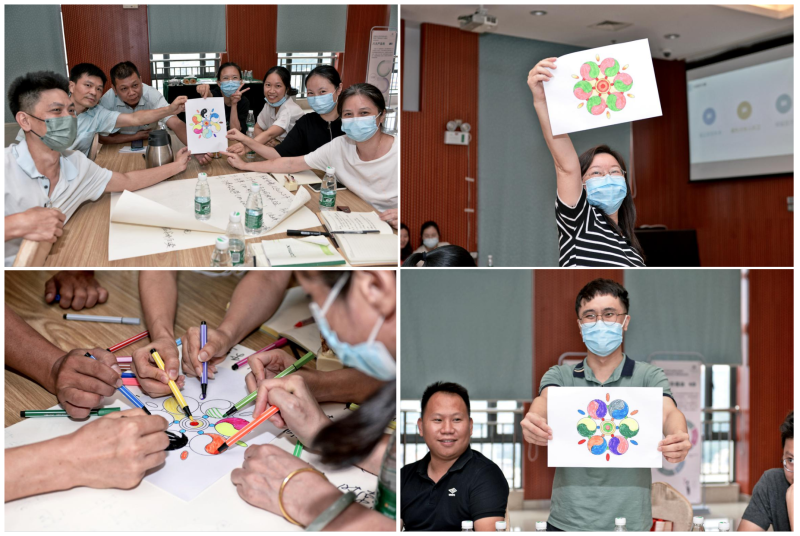 在活動下半段,心理老師介紹了釋壓小工具—曼陀羅繪畫,各組成員們共同體驗、合作完成了曼陀羅作品。
