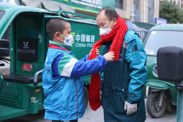 收到禮物的投遞員們很驚喜,也很開心,馬上圍到脖子上試試,與志愿者們合影留念。孩子們更熱情,送上暖貼的時候,大聲地說“你們辛苦了,謝謝你們的付出。”小哥憨憨地笑著回應。
