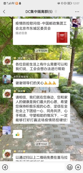 東城區分公司工會針對集中隔離職工,“一對一”進行電話慰問和心理疏導,了解生活情況,給隔離職工家庭寄去慰問信和愛心蔬菜包。西城區分公司工會儲備包含牛奶、方便面、鹵蛋、餅干等食品的供給物資各200箱,并啟動分批次發放方案,支援各支局網點在崗職工,確保一線職工的飲食供應。朝陽區分公司工會多方聯系,購置6750袋防疫代茶飲、100盒連花清瘟膠囊和維生素C等藥品,配發到各部門工會,為職工健康保駕護航。海淀區分公司工會為使用中央空調供暖的網點職工購買了暖水袋保暖。豐臺區分公司工會堅在線上職工小家-----“郵小豐”微信群預約心理咨詢機構老師,開通職工心理援助通道,每天分享防疫小知識,堅定職工抗疫信心和決心。房山區分公司工會購買方便面、火腿腸等加餐食品,組織食堂為投遞等外勤人員制作愛心盒飯,保障堅守一線職工吃上熱乎飯,讓職工在疫情反復的困難條件下有溫暖、有底氣,共克時艱。通州區分公司工會根據部分街鄉封控政策不斷調整慰問方案,為基層網點增配消毒液、洗手液等防疫用品,為基層營業部配送折疊床、被褥等生活用品。平谷區分公司工會為同城郵運司機布置休息宿舍,確保外區回來人員閉環管理。郵區中心工會為封控區過生日的職工送去生日蛋糕、長壽面和祝福,企業的關心關愛。 發行中心在做好疫情防控基礎上,組織閉環場地職工適當開展跳繩、踢毽等體育活動,保障職工身心健康。(北京郵政工會)