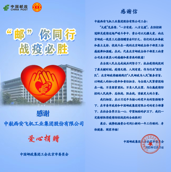 12月22日,北京市郵政工會(huì)收到中航西安飛機(jī)工業(yè)集團(tuán)股份有限公司工會(huì)捐贈(zèng)的10萬(wàn)元,表達(dá)了該公司對(duì)北京郵政一線投遞人員的慰問(wèn)與關(guān)愛(ài)。