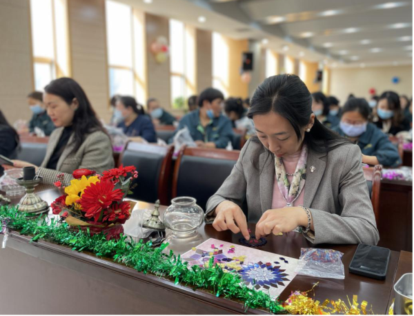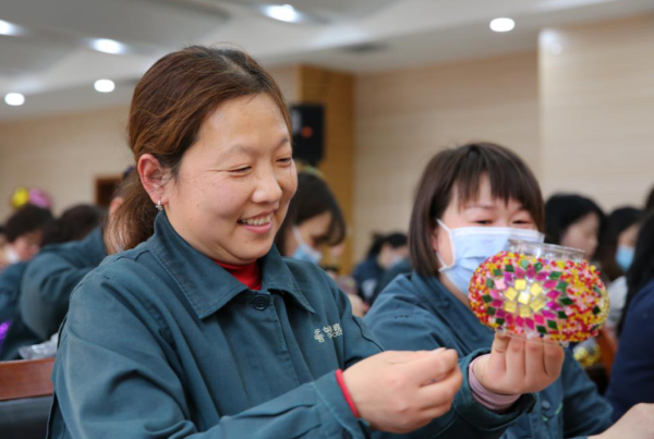 活動現場,手作老師介紹了粘貼方法及注意事項,并進行了詳細指導。女職工們分別在燈罩上用彩色的琉璃片和玻璃珠粘貼出了理想的圖案。繽紛五彩的琉璃玻片在指尖飛舞,一個個藝術創作天馬行空,多姿多彩的花紋,寄托了大家對美好生活的希冀和憧憬。