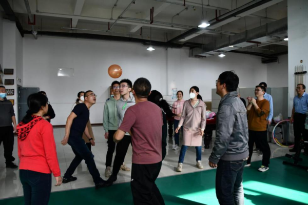 第二個“氣球大戰”項目,由每隊派出3名選手,用頭把氣球頂到對面,沒接住就丟分。為了接住氣球,隊員們一會蹲下去,一會跳起來,忙的不亦樂乎。比分交替上升,緊張的局面讓場邊的觀眾們也激動起來,不斷為自己的隊員打氣加油。