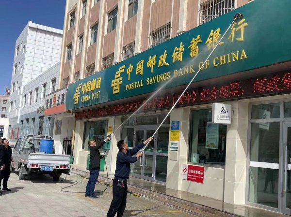 3月21日一早,在市分公司工會的統一安排部署下,辦公室及市場營銷部人員開著車載著水箱及噴水槍,長桿拖把前往格爾木市各營業網點。到達網點后,大家開始對門頭進行整體沖刷,清洗過的門頭牌匾煥然一新,干凈靚麗,清洗現場一翻繁忙勞碌的景象。