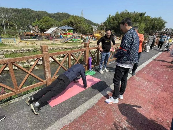 為增加健步行的趣味性,活動采取了以黨員帶群眾結構組成5支隊伍競賽方式,健步行途中設置了4個挑戰關卡,成功過關后完成健步行時間最短的隊伍為優勝團隊。關卡一“悠悠人生”,要求隊伍集體過軟索橋,考驗隊伍的組織和紀律性;關卡二“德藝雙磬”,要求每隊每人完成10個跳繩后念完一段繞口令集體通過,考驗隊員的體力和反應力;關卡三“剛柔并濟”,要求每隊男隊員累計完成50個俯臥撐,女隊員累計完成50個仰臥起坐后通過,允許接力完成,考驗隊員的互助配合性;關卡四“高唱紅歌”,要求抽取一首紅歌全隊合唱完成。