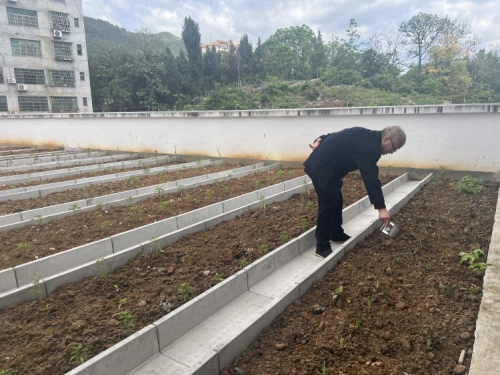 這是一個(gè)艷陽高照的上午,綠植小組的成員們?cè)谔炫_(tái)澆著花,那是春天剛剛播種格桑花,一轉(zhuǎn)眼已經(jīng)快成為一片花海了。天臺(tái)的左邊是花園,右邊是菜園。菜園里番茄已經(jīng)結(jié)了果,草莓也快熟透。
