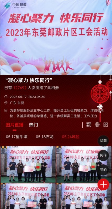 與此同時,東莞郵政工會借助平臺進行了活動圖片直播,為員工定格美好時光,留下歡樂回憶。截至5月24日第三場片區活動結束,直播相冊瀏覽量已超10萬人次。