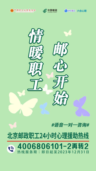 為關愛廣大職工心理健康,2023年6月13日,北京市郵政工會聯合中國職工發展基金會、六合熙誠心理熱線,開通“情暖職工 郵心開始” 北京郵政職工心理熱線,為大家提供24小時心理援助。面對生活及工作中的壓力與困擾,如職工需要心理服務,可及時撥打24小時心理熱線 400-680-6101-2再轉2(北京郵政心理咨詢專線),專業心理咨詢師24小時在線傾聽心聲。