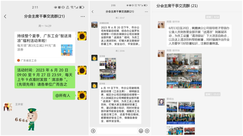 此外,在省總工會“智送清涼”活動啟動前,中山市郵政工會已通過微信群、工作群積極宣傳發動,做好鋪墊工作,讓廣大員工在炎炎夏日享受更多省總清涼福利。