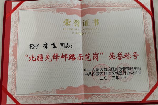 李飛作為一名干線郵運駕駛員和兼職機要押運員,一只腳踩的是責任,另一只腳踩的是生命。他時刻緊繃“安全”這根弦,全面貫徹“安全第一,預防為主”的方針,認真學習消化有關安全的規定,熟練掌握有關交通法規,努力鉆研車技,自覺做到遵章守紀、文明駕駛。曾連續多年被授予內蒙古自治區“文明貨運駕駛人”、“五一勞動獎章”及“內蒙古自治區勞動模范”等榮譽稱號。