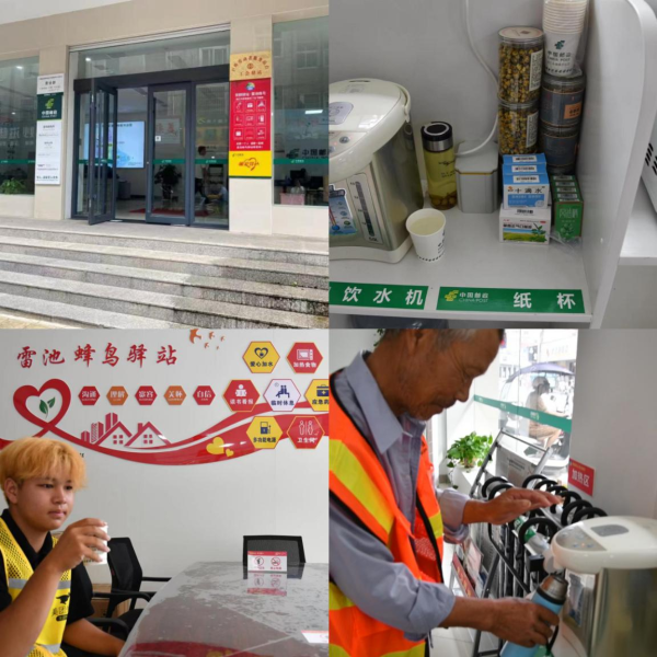 在望江郵政雷池路戶外勞動者驛站內,幾名環衛工人和美團外賣小哥在站點內喝喝水、歇歇腳,暑熱瞬間消退了不少。驛站內,微波爐、飲水機、藥箱、充電器等物品一應俱全,可以滿足戶外工作者的多樣需求。為落實好戶外勞動者驛站建設工作,安慶郵政工會及下轄的各(縣)市郵政工會結合網點實際情況,整合服務資源,從解決戶外勞動者吃飯、喝水、休息等實際需求出發,本著有序逐步推進的原則,積極與當地總工會對接,目前已建成七處“戶外勞動者驛站”,提供飲水、加熱食物、臨時休息、應急藥箱、手機充電等基礎服務,讓大家隨時享受來自郵政人的貼心服務。