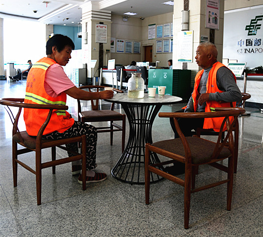亳州郵政芍花路營業所戶外勞動者驛站環衛工人正在喝茶休息