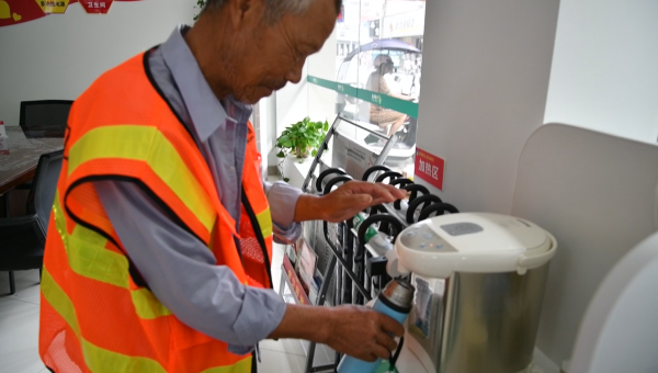 望江縣郵政雷池路支局戶外勞動者驛站環衛工人正在接熱水