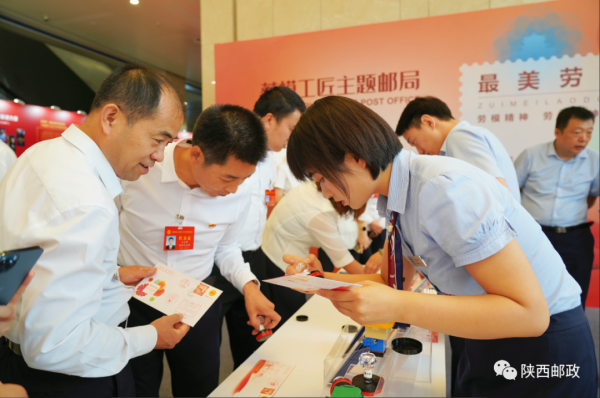 在現場,西安市分公司工作人員為代表們提供加蓋陜西省工會十五大紀念封郵戳、贈送勞模工匠明信片、制作聲音郵件等服務。代表們紛紛前來主題郵局參觀打卡,體驗“聲音郵局”,拍照留念,并郵寄紀念封和明信片。