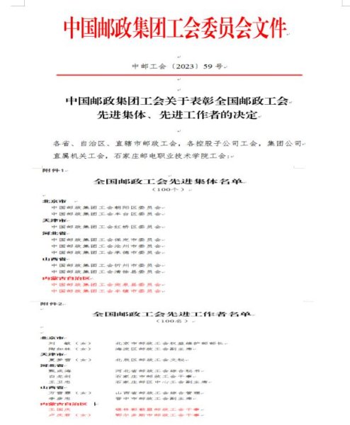 為表彰先進,樹立典型,近日,中國郵政集團工會決定,對全國郵政工會100個先進集體和100名先進個人進行表彰,我區共有2個單位,2名個人上榜。其中,中國郵政集團工會突泉縣委員會、中國郵政集團工會豐鎮市委員會被授予“全國郵政工會先進集體”榮譽稱號,錫林郭勒盟郵政工會干事王國慶、鄂爾多斯市郵政工會干事盧慶君被授予“全國郵政工會先進工作者”榮譽稱號。