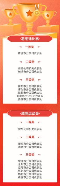 經(jīng)過為期兩天緊張激烈的角逐,株洲市分公司代表隊(duì)最終奪得羽毛球比賽冠軍,省分公司機(jī)關(guān)代表隊(duì)最終奪得趣味運(yùn)動(dòng)會(huì)冠軍。