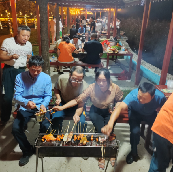 游戲結束后,燒烤活動開始。10余個烤爐全部開啟,每個烤爐前都圍著一些員工,有調火的,有調味的,香味彌漫,烤肉和烤腸讓人垂涎欲滴。大家游走在各個烤爐間品嘗著美味,每次烤熟后馬上就一搶而空。
