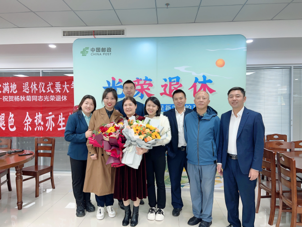 10月10日,黔江郵政工會在職工食堂舉辦退休職工歡送儀式,歡送楊秋菊同志光榮退休。儀式上,黔江郵政總經理屈景勇為退休職工楊秋菊同志送上祝福的鮮花、紀念品及一封感謝信,感謝她多年來對黔江郵政發展所做的貢獻,祝福她把退休生活過得豐富多彩,常“回家”看看。