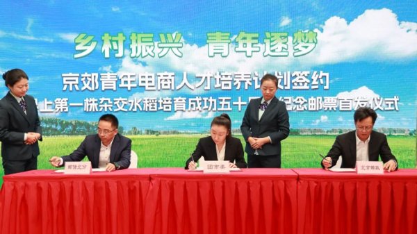 在簽約儀式現場,密云區副區長馬超與中國郵政集團有限公司北京市分公司副總經理范小榮共同為世界上第一株雜交水稻培育成功五十周年紀念郵票和首日封揭幕,與會嘉賓也通過郵票這枚小小的“國家名片”,一起感受我國農業現代化建設的歷史進程和在鄉村振興領域所取得的偉大成就。(北京郵政工會)