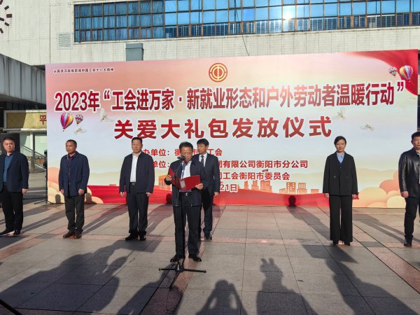冬日暖陽,情滿人心。11月21日下午,由衡陽市總工會(huì)主辦、衡陽市郵政工會(huì)承辦的2023年“工會(huì)進(jìn)萬家·新就業(yè)形態(tài)和戶外勞動(dòng)者溫暖行動(dòng)”關(guān)愛大禮包發(fā)放儀式,在衡陽火車站前坪廣場(chǎng)舉行,現(xiàn)場(chǎng)為快遞員、外賣騎手、環(huán)衛(wèi)工人、城管人員、貨車司機(jī)等新就業(yè)形態(tài)和戶外勞動(dòng)者代表送去工會(huì)組織的關(guān)愛和慰問。衡陽市人大常委會(huì)副主任、市總工會(huì)主席王東文出席活動(dòng)并講話,衡陽市總工會(huì)黨組書記、常務(wù)副主席楊青青主持活動(dòng),衡陽市郵政分公司黨委書記、總經(jīng)理杜輝代表承辦單位致辭,衡陽市總工會(huì)、珠暉區(qū)委、珠暉區(qū)總工會(huì)、城管執(zhí)法局、郵政管理局、交通運(yùn)輸局工會(huì)聯(lián)合會(huì)、道路貨物運(yùn)輸行業(yè)工會(huì)、快遞行業(yè)工會(huì)聯(lián)合會(huì)等相關(guān)單位負(fù)責(zé)人參加活動(dòng)。