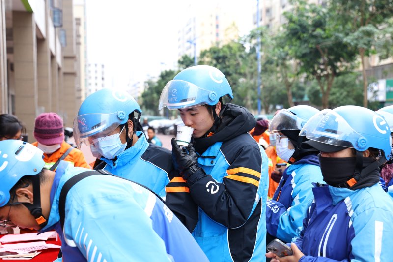 當天,工作人員在茂名市金城路營業所郵愛驛站門前進行熱飲派發,用姜茶為新業態勞動者們驅寒意、暖身心,出席現場的領導嘉賓和快遞員、環衛工人、外賣員、送貨員等120多位新業態勞動者代表一起感受著這一份暖心的活動氛圍。