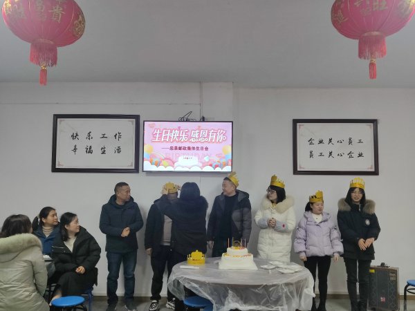“祝你生日快樂......”12月20日,在忠州郵政的食堂里,傳來了耳熟能詳?shù)纳崭枰魳罚?名戴著生日帽的“壽星”正接受著來自大家的祝福。
