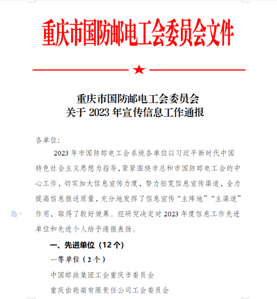 1月11日,根據《重慶市國防郵電工會委員會關于2023年宣傳信息工作通報》,重慶市郵政工會以第一名成績獲重慶市國防郵電工會系統2023年度信息工作先進單位一等獎,重慶市郵政工會朱雅妮、榮昌區郵政工會張璇2名員工獲信息工作先進個人。