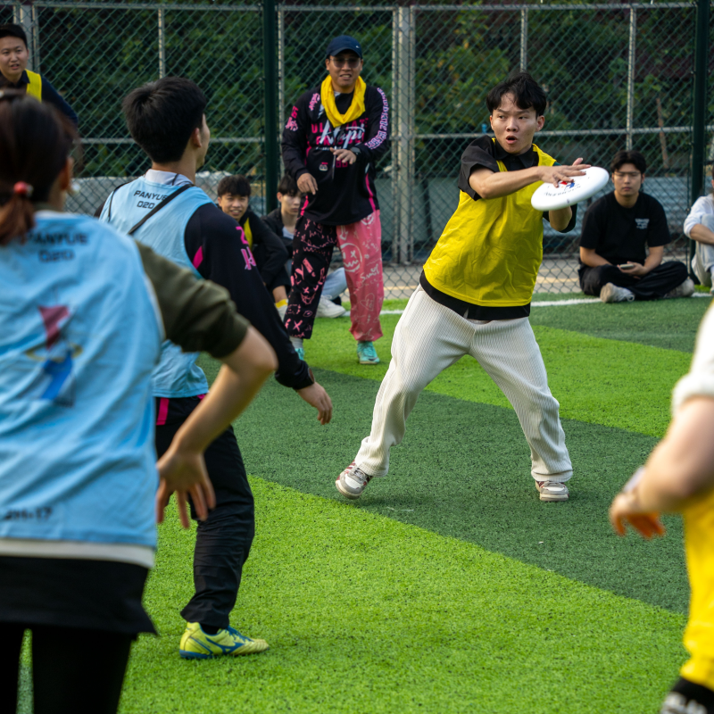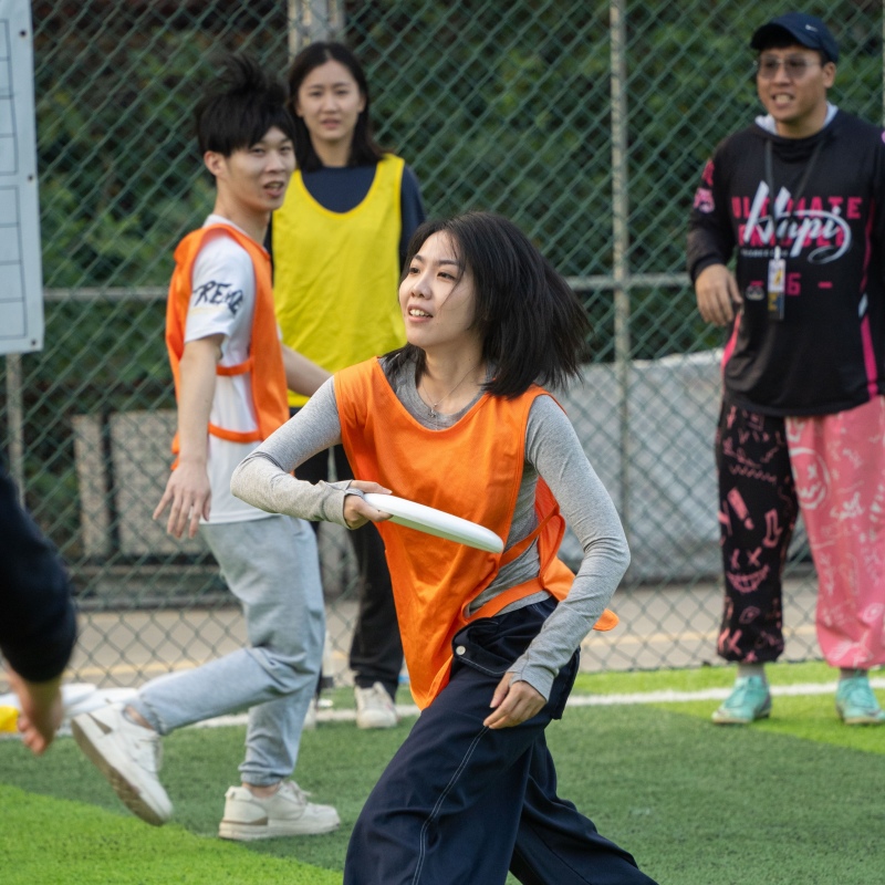 在教練的快速教學下,員工們基本熟悉了飛盤玩法和比賽規則,并自行組隊開始了精彩的極限飛盤比賽。躲避對手靈活走位、配合隊友跳躍接盤、瞄準時機投擲對方半場,最后飛身接盤落定得分區域,四個小隊的得力健將在你追我趕的熱烈活動氛圍下,默契配合,接連得分。