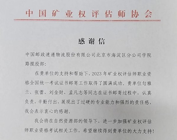 新年伊始,學院路攬投部全體人員以良好的精神狀態和飽滿的熱情投入各項工作。與之對應的,用戶用感謝信和錦旗給他們的工作打出一百分。“謝謝你們的付出,證書寄遞工作已圓滿收官,為郵政的服務點贊!”1月10日,中國礦業權評估師協會的崔老師專程來到學院路攬投部送上感謝信,并表示,由于寄遞的物品比較特殊,學院路攬投部提供了郵件查詢的延伸服務,寄遞中出現的問題也都得到妥善處理,為2023年礦業權評估師職業資格全國統一考試工作取得圓滿成功提供了有力保障。
