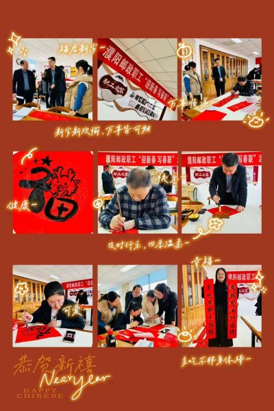 新年伊始,春節(jié)降至。為豐富職工精神文化生活,營(yíng)造歡樂(lè)吉祥、溫暖和順的節(jié)日氛圍,增強(qiáng)企業(yè)凝聚力,1月25日,濮陽(yáng)市郵政工會(huì)組織職工開(kāi)展“迎新春 寫春聯(lián)”活動(dòng)。活動(dòng)邀請(qǐng)擅長(zhǎng)書法的郵政干部現(xiàn)場(chǎng)揮毫潑墨,熱情高漲的職工們臨場(chǎng)發(fā)揮筆走龍蛇,一幅幅寓意吉祥、充滿祝福的春聯(lián)和“福”字躍然紙上,用不同的字體、不同的風(fēng)格,為大家送上美好的新春祝福。整個(gè)活動(dòng)氣氛熱烈,展示了郵政職工良好的精神風(fēng)貌。新的一年,濮陽(yáng)郵政干部職工將以更加昂揚(yáng)的工作作風(fēng),更加飽滿的精神狀態(tài),穩(wěn)步實(shí)干,為公司的高質(zhì)量發(fā)展貢獻(xiàn)力量。(河南省郵政工會(huì))