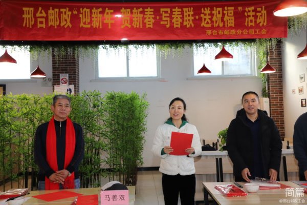 邢臺(tái)市分公司副總經(jīng)理、工會(huì)主席周玲在寫春聯(lián)活動(dòng)上發(fā)表了熱情洋溢的致辭,感謝馬良辰書法藝術(shù)學(xué)校的老師們?yōu)猷]政員工書寫春聯(lián),也借此機(jī)會(huì)提前給郵政員工們致以春節(jié)的問(wèn)候,也預(yù)祝本次活動(dòng)舉辦成功。