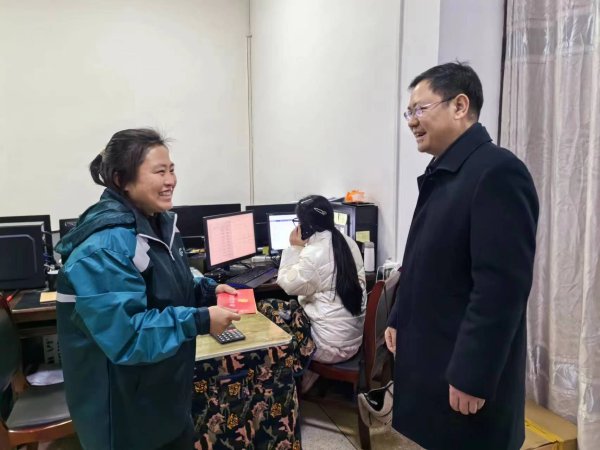 在慰問網點時,領導們與基層員工親切交談,了解網點的人員配置、余額規模、活動開展、跨賽進度等情況,聽取網點在發展中遇見的難題,針對難題進行答疑解惑給出建議,同時叮囑大家在發展業務的同時,也要注意防寒保暖,保護自身安全。