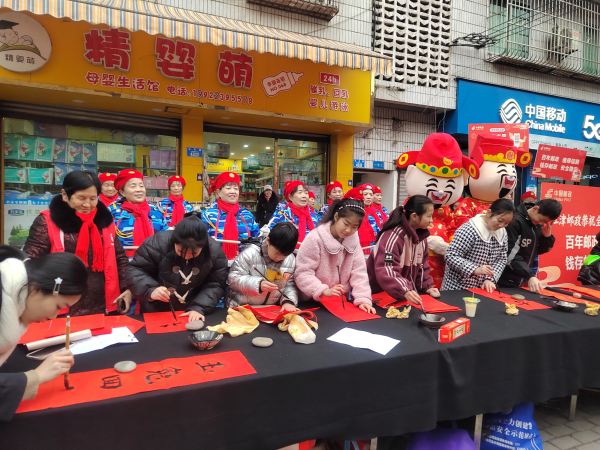 春節將至、年味漸濃。為大力弘揚中華優秀傳統文化,豐富職工群眾精神文化生活,1月30日,江津郵政工會聯合朱楊鎮社區邀請“小小書法家”們在朱楊鎮街開展“送萬福·進萬家”書法公益活動,為廣大市民和郵政員工寫春聯,送“福”字,送上濃濃的新春祝福。