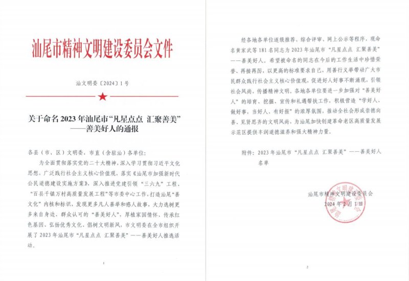 近日,汕尾市精神文明建設委員會印發《關于命名2023年汕尾市“凡星點點 匯聚善美”——善美好人的通報》,汕尾市分公司蔡建定、施立森、胡少年等3位同志榮獲2023年度全市“善美好人”稱號。