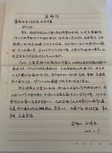“當(dāng)我得知大家為我獻(xiàn)血的消息時(shí),內(nèi)心充滿了感動(dòng),感動(dòng)于你們的無私大愛。正是這份濃濃的愛意,讓我感受到公司領(lǐng)導(dǎo)對(duì)員工無比的關(guān)懷。”2月26日,重慶市郵政工會(huì)收到一封來自市分公司服務(wù)質(zhì)量部客戶服務(wù)中心勞務(wù)派遣員工張娣容手寫《感謝信》。信中的文字簡(jiǎn)單樸實(shí),字里行間充滿了溫情和暖意,表達(dá)了她對(duì)公司和同事們讓自己重獲新生的感激之情。